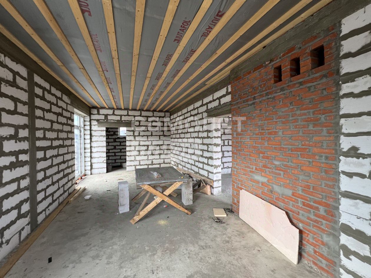 В доме 3 большие спальни, широкий коридор, санузел совмещен, кухня гостиная с выходом на террасу, котельная с функцией санузла. Построен качественно, используя железобетонный каркас (колонны,сердечники утеплены), газоблок 30.