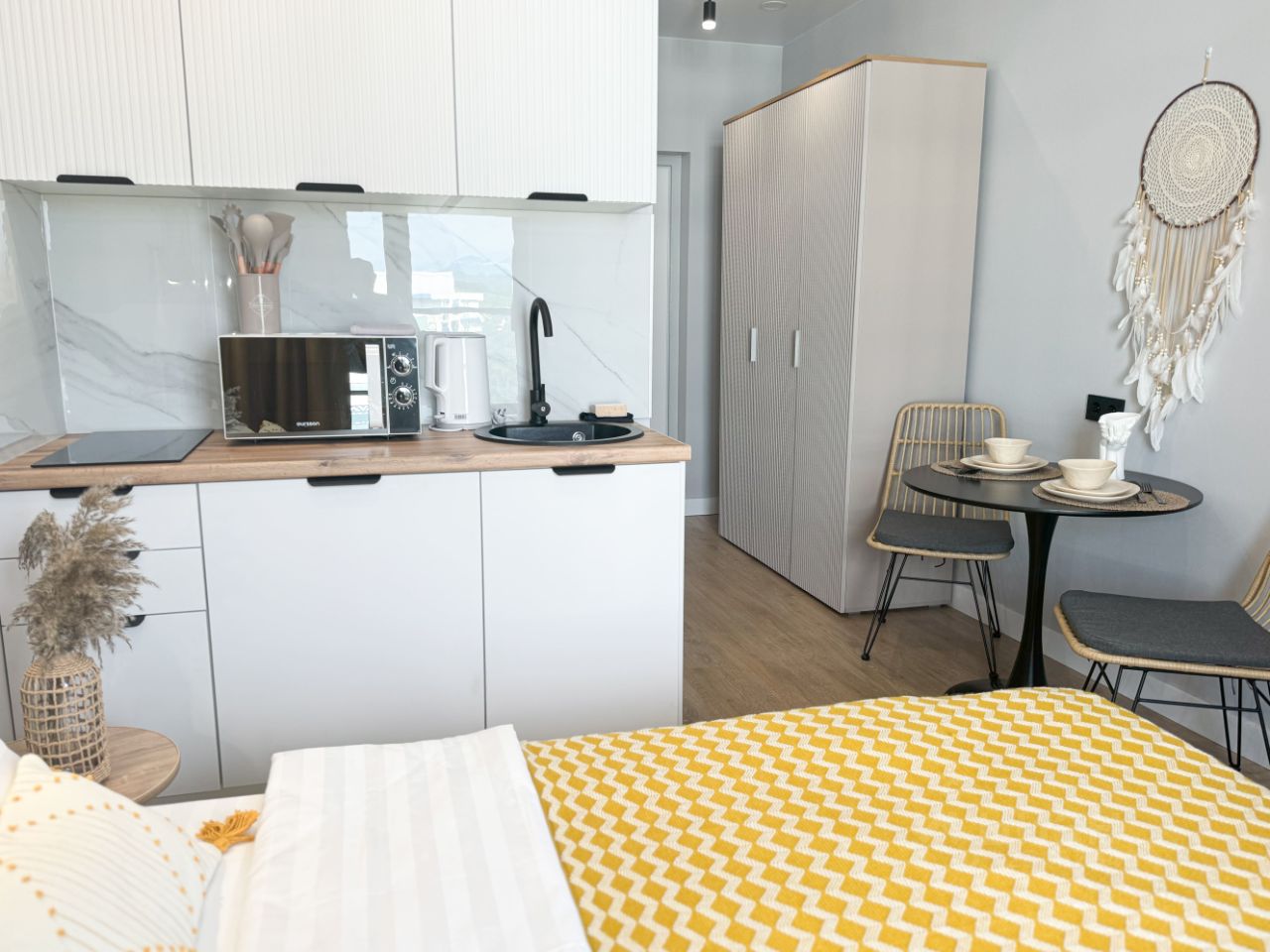 Мы всегда рады нашим гостям и хотим, чтобы Вам было комфортно, поэтому для Вас: Двухместная кровать с удобным матрасом Всегда свежее, белоснежное постельное белье и мягкие полотенца Смарт ТВ с доступом к видеоконтенту интернет-сервисов Гладильные принадлежности Кондиционер (сплит-система), стиральная машина, сушилка, фен, утюг В кухонной зоне: холодильник, микроволновка, варочная панель, чайник, необходимая посуда, столовые приборы и принадлежности Ванная комната с душевой кабиной Высокоскоростной Wi-Fi