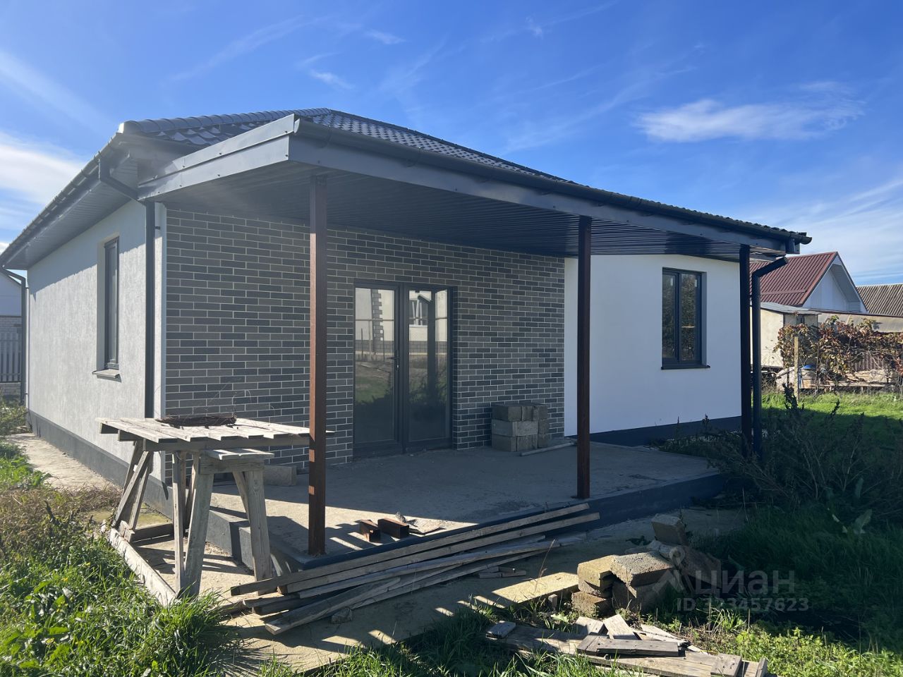 Дом в предчистовой отделке. Коммуникации: электричество 15 кВт, вода -есть возможность подключиться к центральному водоснабжению, канализация- септик, газ проходит по улице.