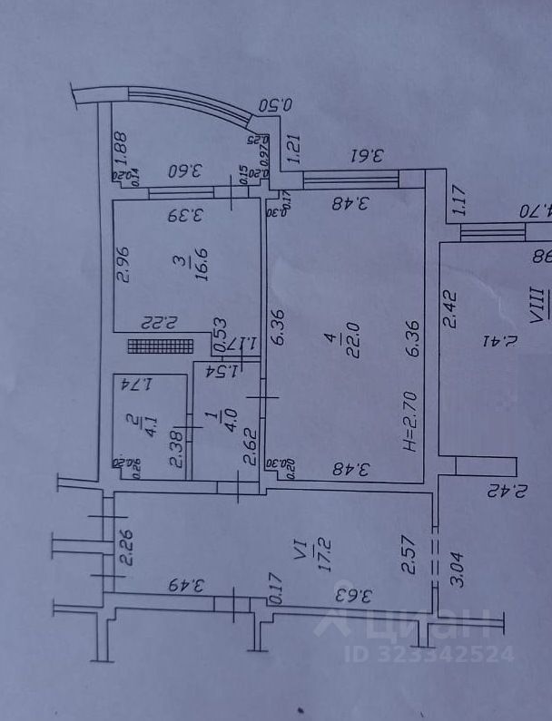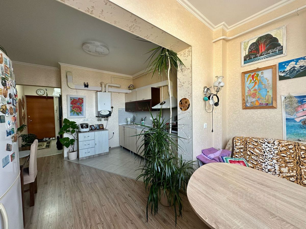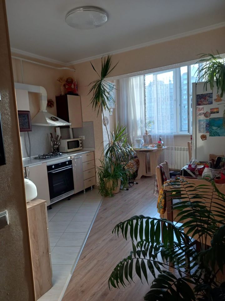 Жилая комната 22кв.м., кухня 16,6кв.м., санузел совмещенный с ванной, лоджия присоединена к кухне.