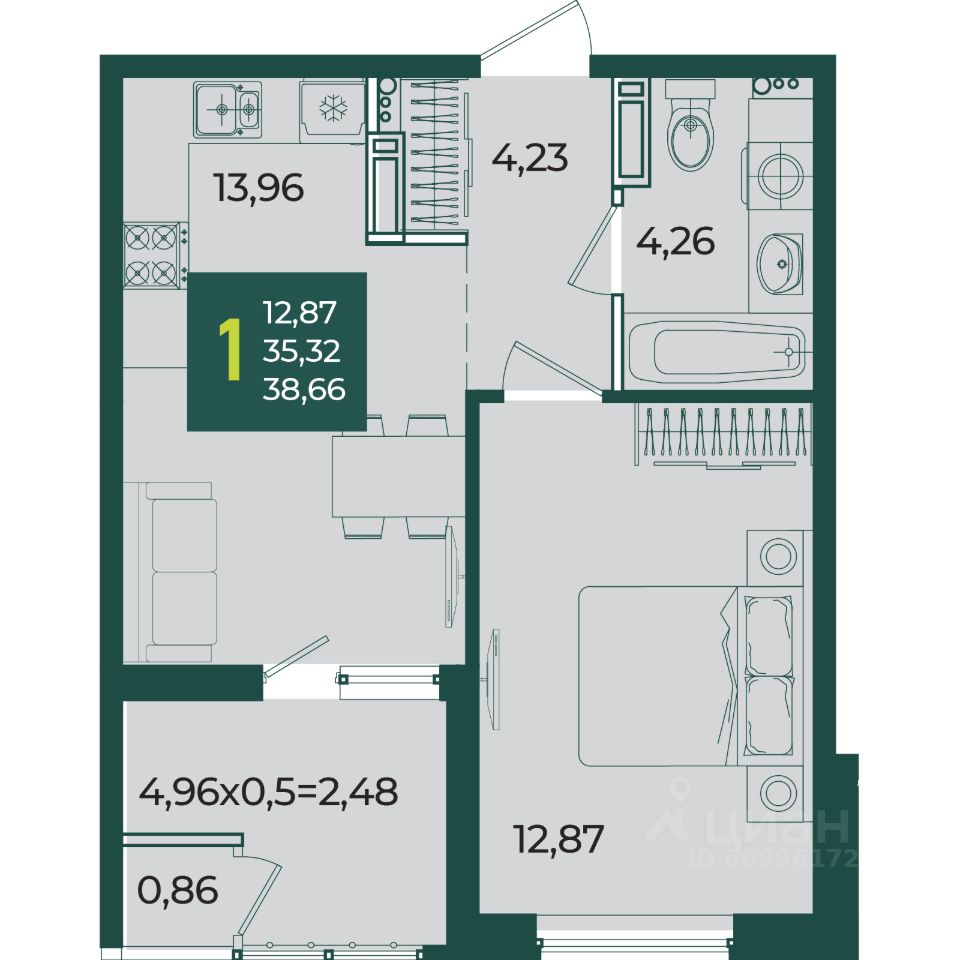 Общая площадь38,66 м2
