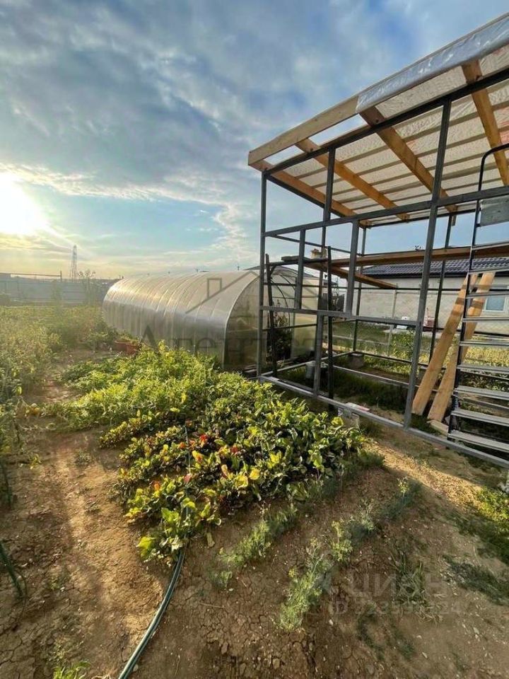 Участок ровный, правильной формы. В саду растут плодоносящие деревья - яблоня, слива, черешня, инжир, виноград и другие, украшают участок туи и можжевельник.