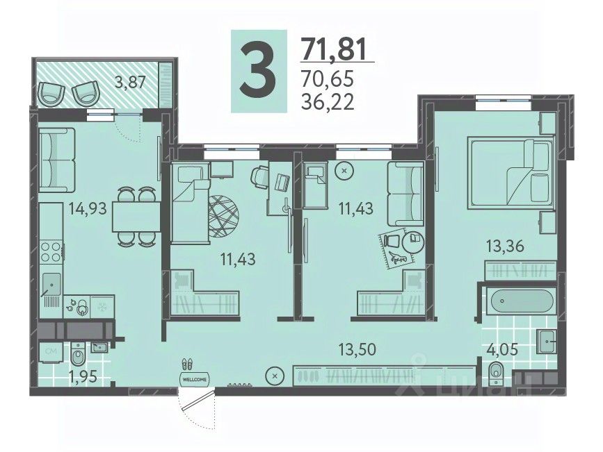 Общая площадь71,23 м2