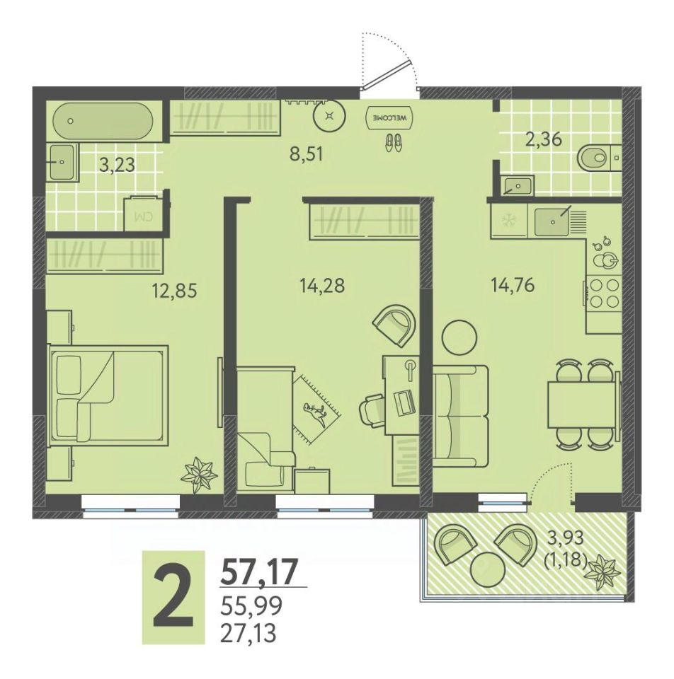 Общая площадь58,68 м2