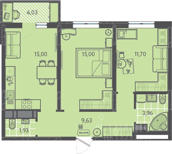 Общая площадь57,39 м2