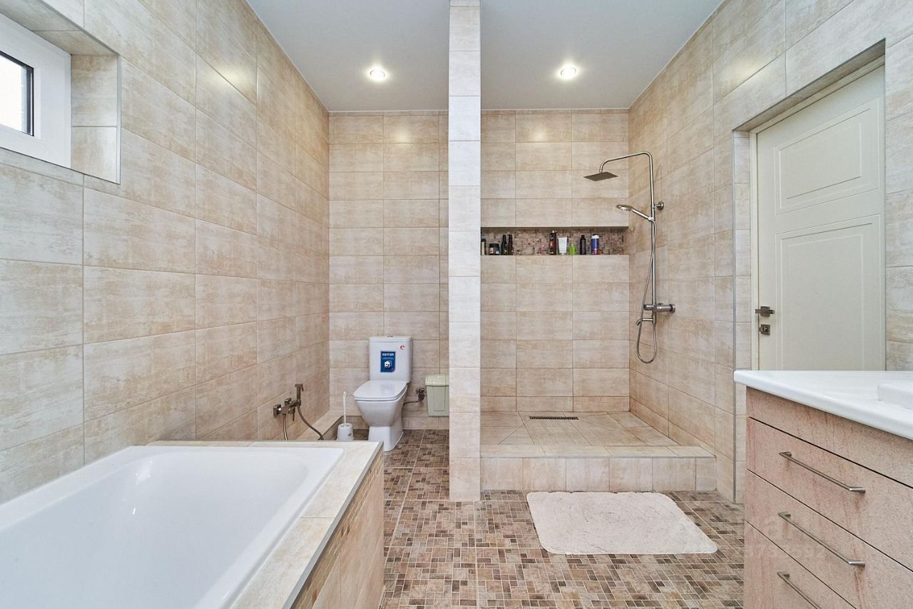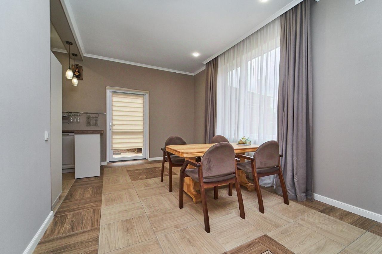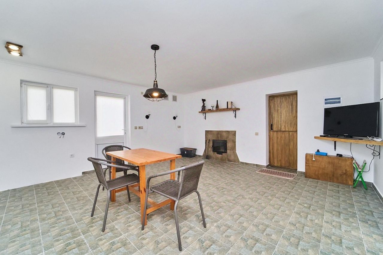 Внутри дома вы найдете спальню с гардеробной, просторную кухню-гостиную, кабинет и ванную комнату с ванной и душем. Все помещения отделаны керамической плиткой, а полы оборудованы системой теплого пола. Дом отапливается газом, есть артезианская скважина и два септика (для дома и бани).