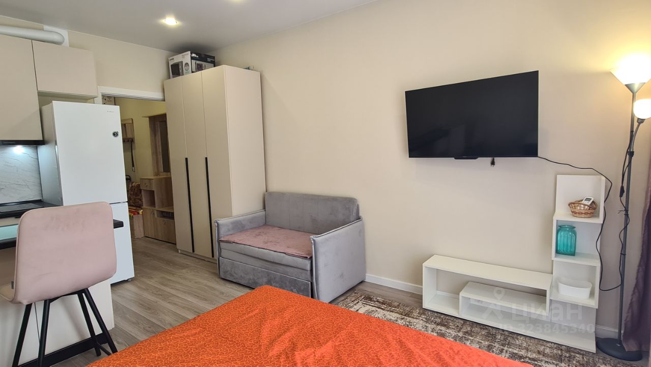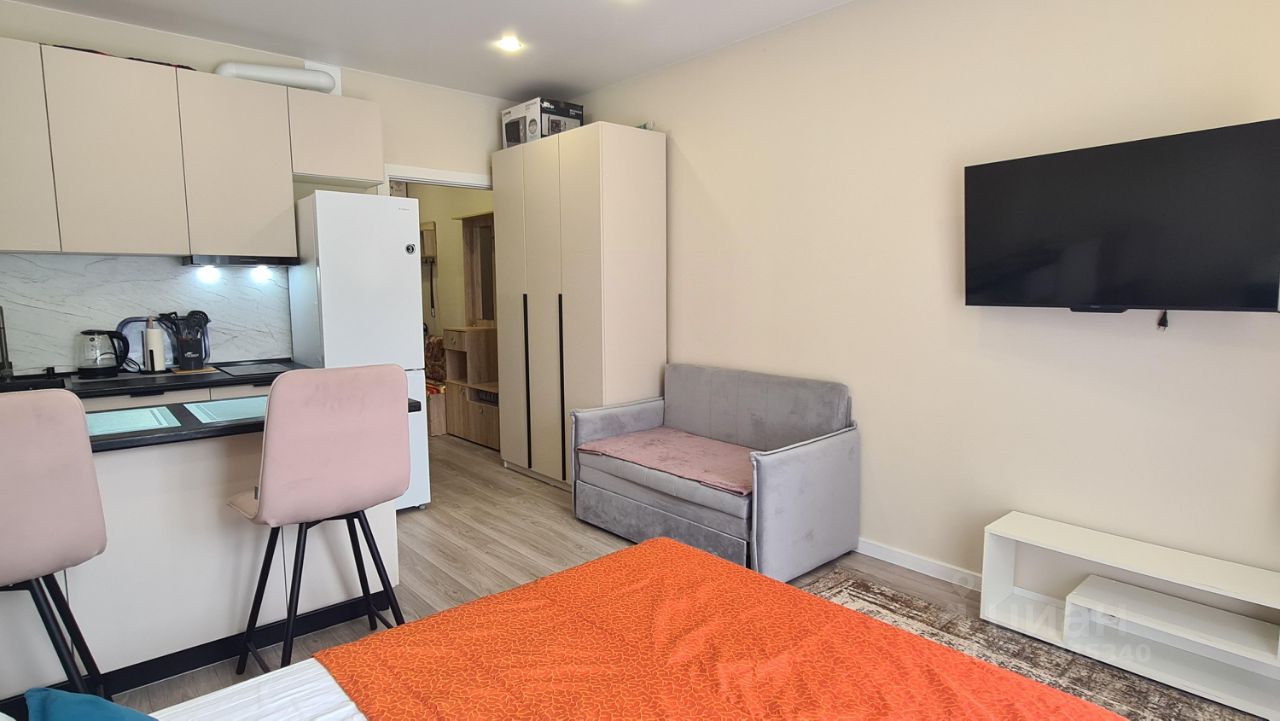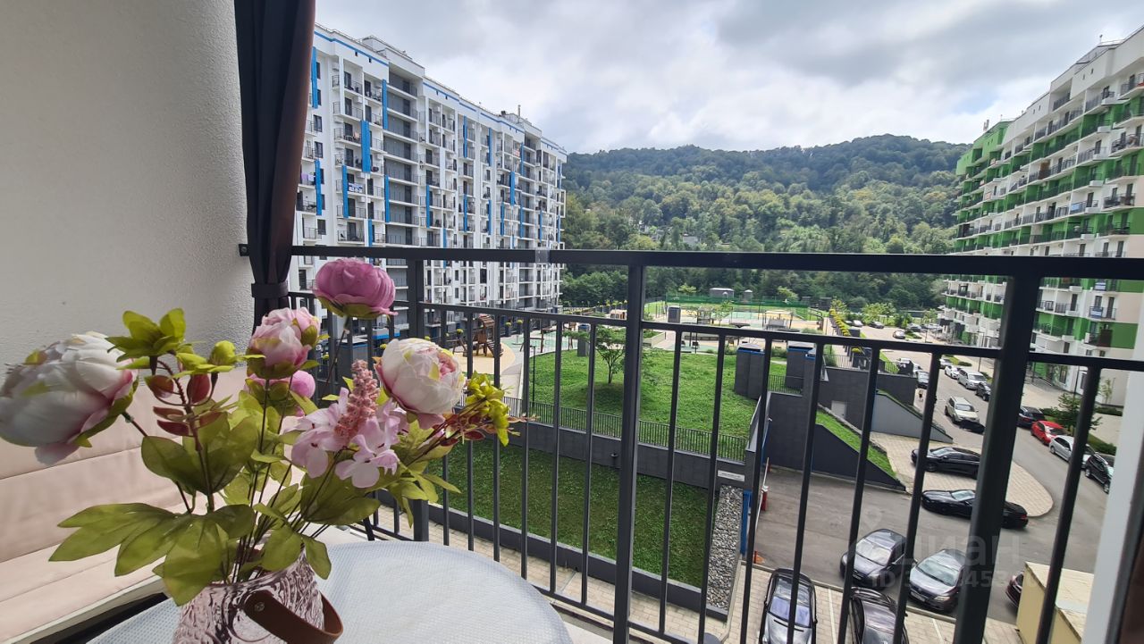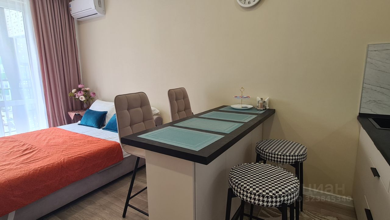 Уютная новая студия помесячная аренда. Новый ремонт, мебель, техника, посуда. Ремонт делали для себя. В квартире очень уютно и красиво. Имеется балкон с видом на лес и реку. Во дворе имеется парковка, магазин Магнит, возле дома остановка автобуса. До моря две остановки всего. В доме центральные коммуникации, отопление.