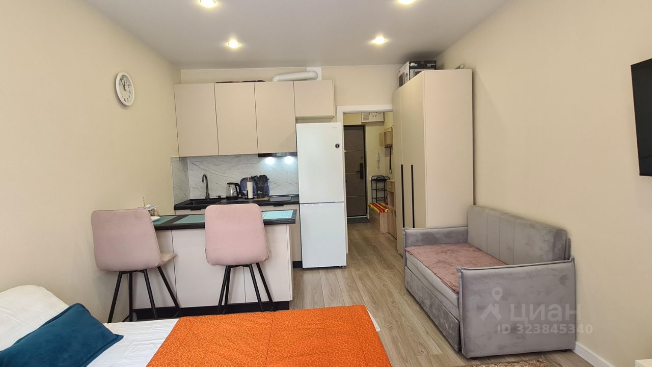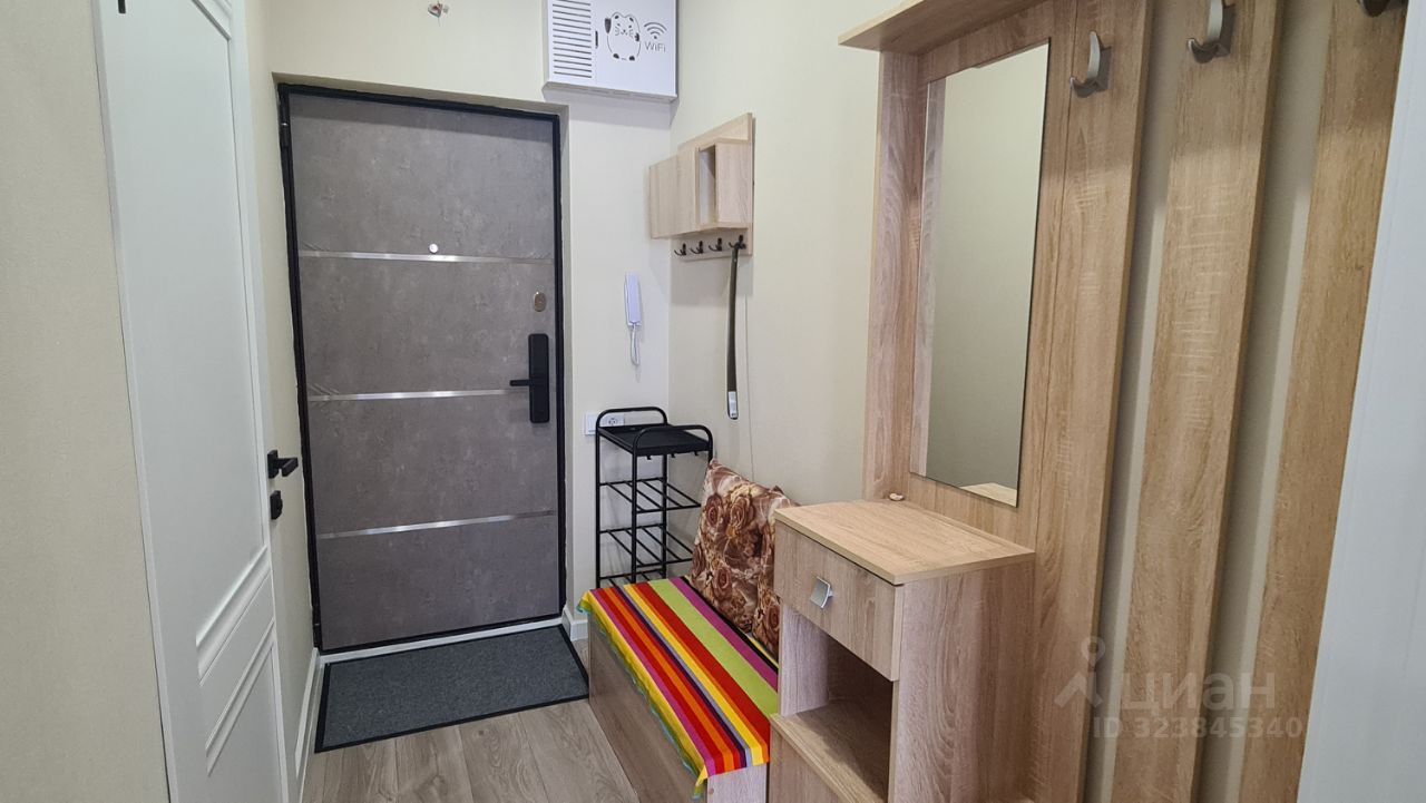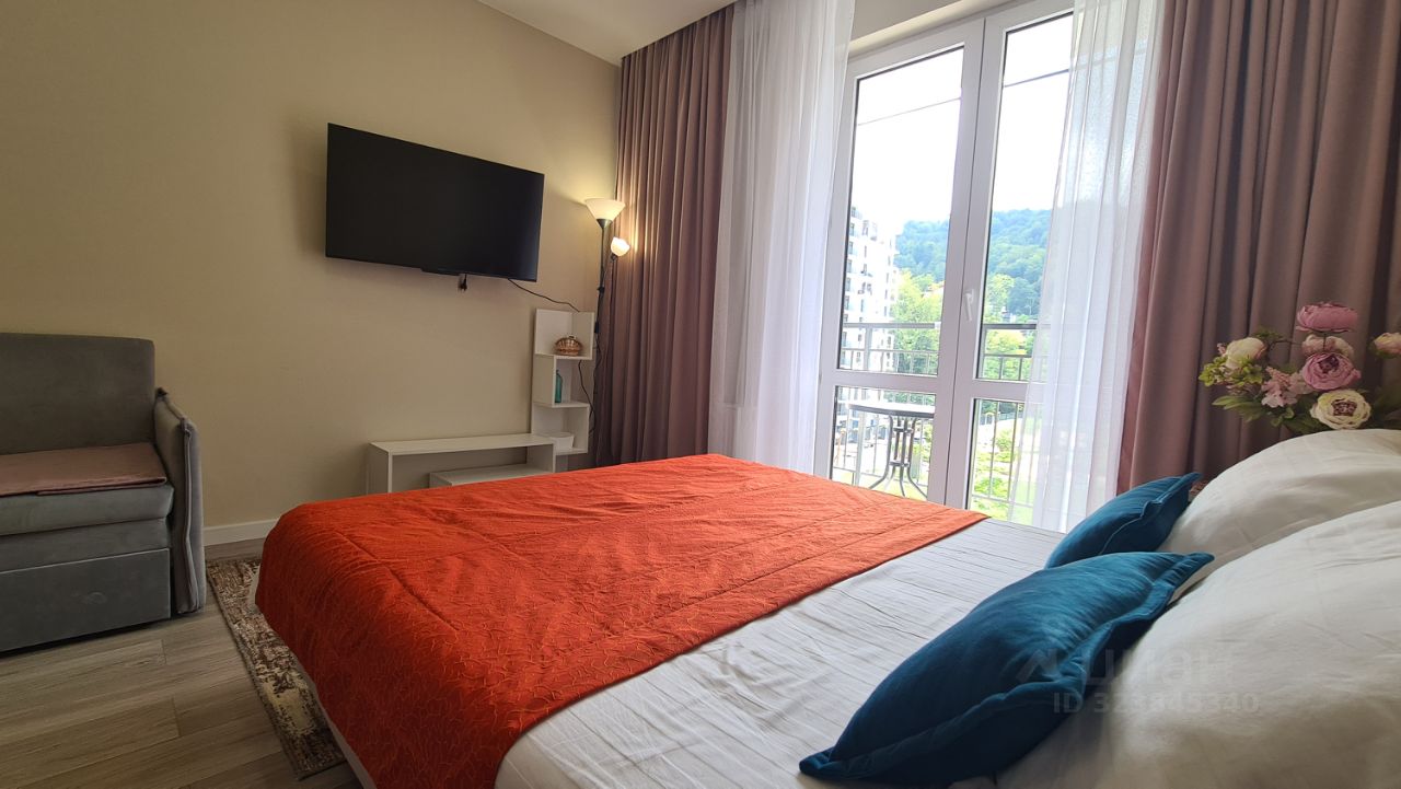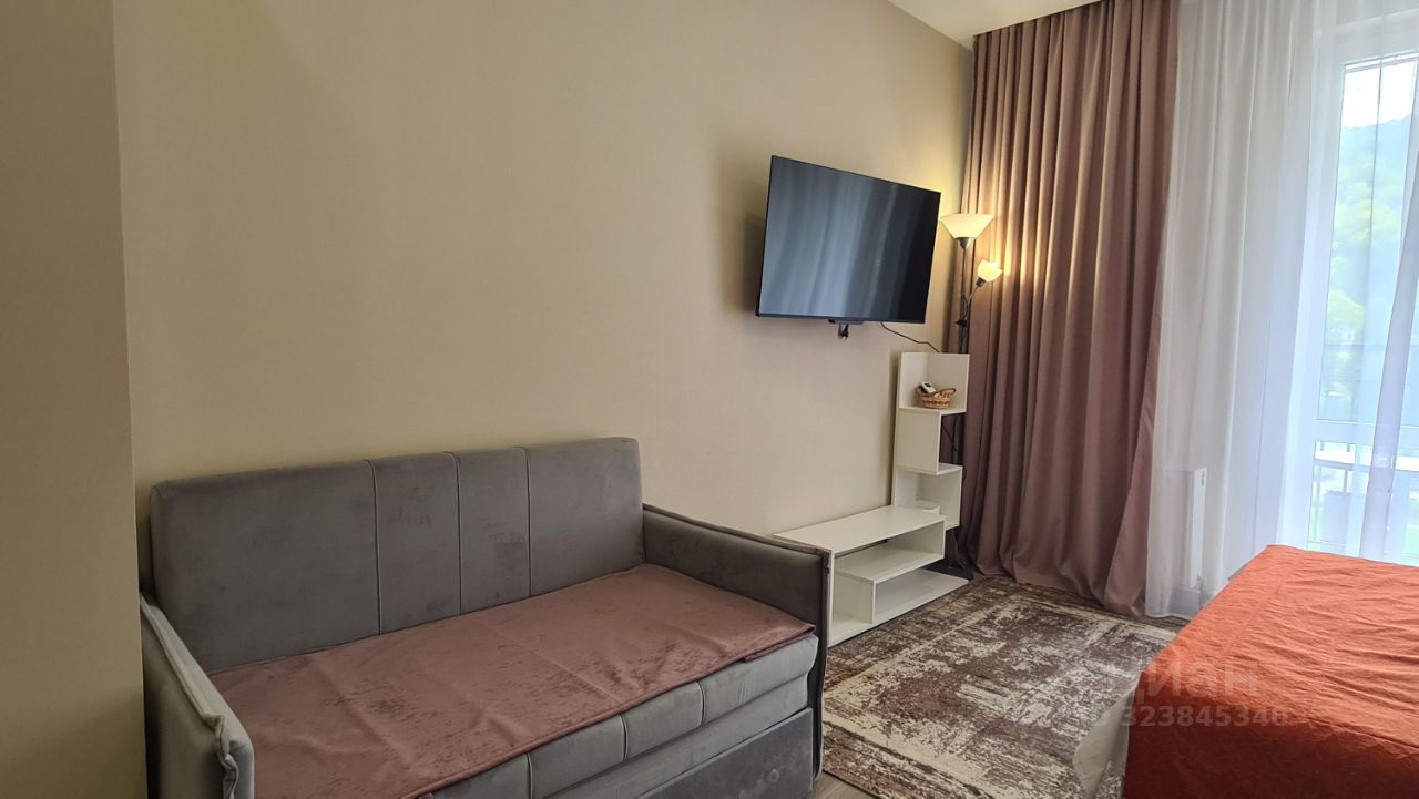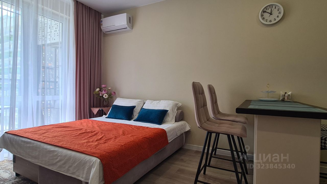 Уютная новая студия помесячная аренда. Новый ремонт, мебель, техника, посуда. Ремонт делали для себя. В квартире очень уютно и красиво. Имеется балкон с видом на лес и реку. Во дворе имеется парковка, магазин Магнит, возле дома остановка автобуса. До моря две остановки всего. В доме центральные коммуникации, отопление.
