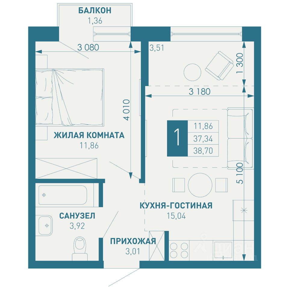 Общая площадь38,7 м2