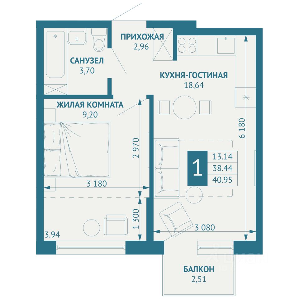 Общая площадь40,95 м2