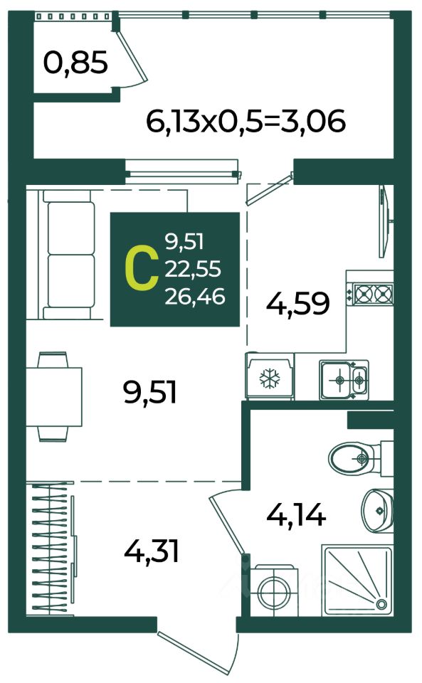 Общая площадь26,46 м2