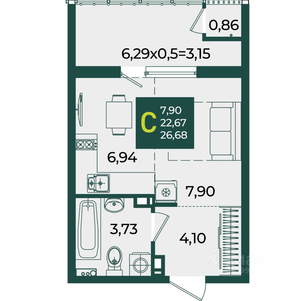 Общая площадь26,68 м2