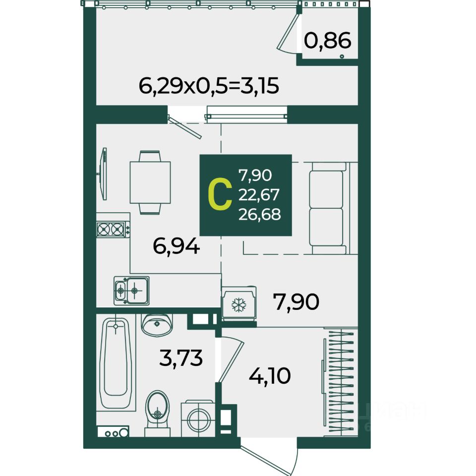 Общая площадь26,68 м2