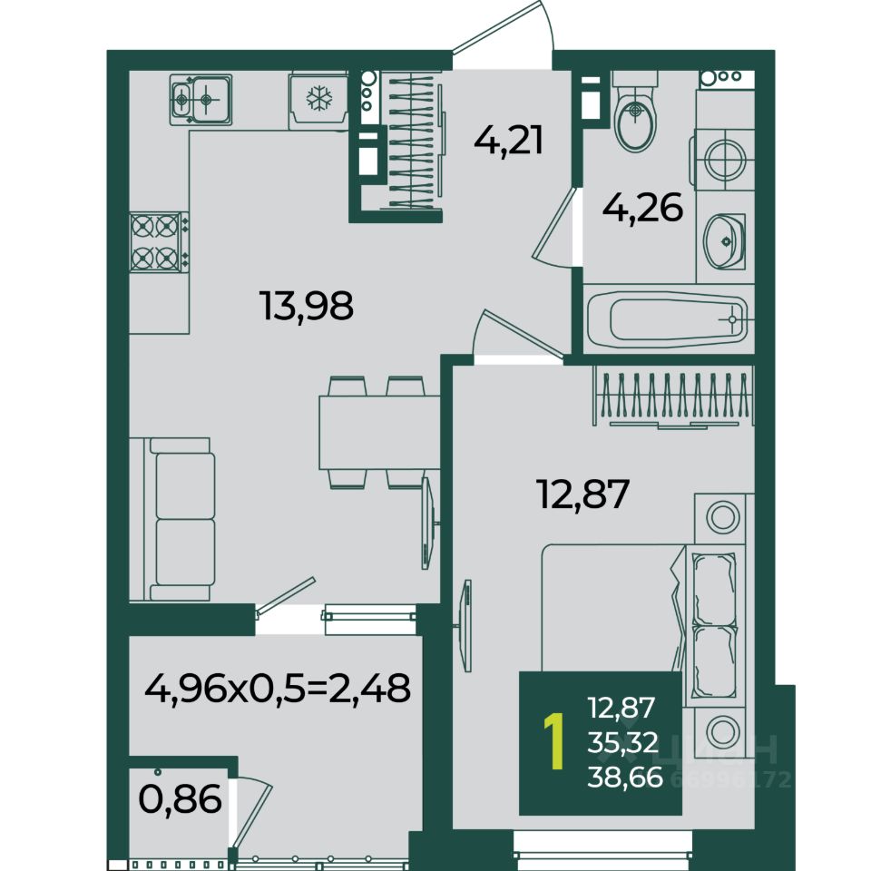 Общая площадь38,66 м2