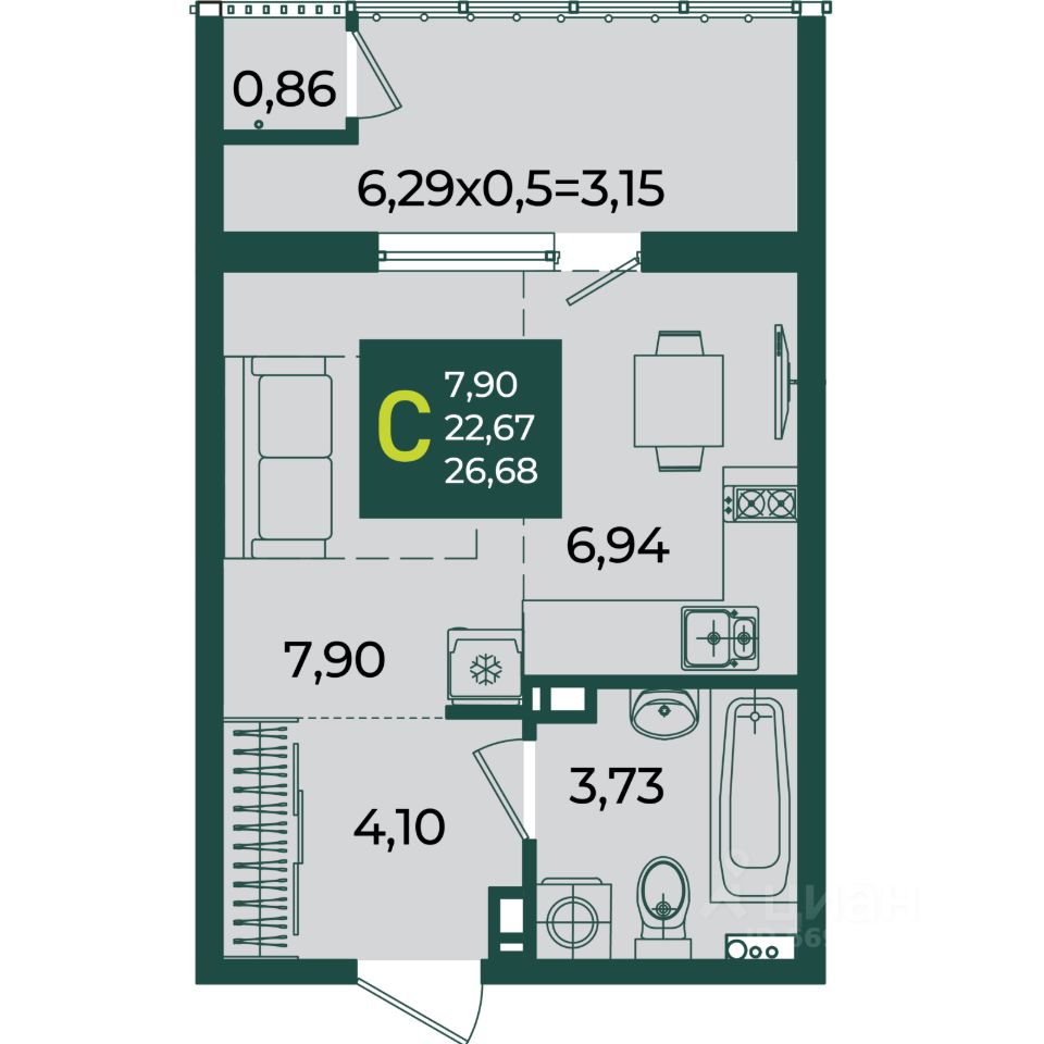 Общая площадь26,68 м2