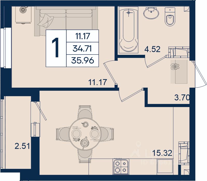 1 комнатная квартира с ремонтом 35.96 м², на 3 этаже в жилом комплексе ''Дом 101''.