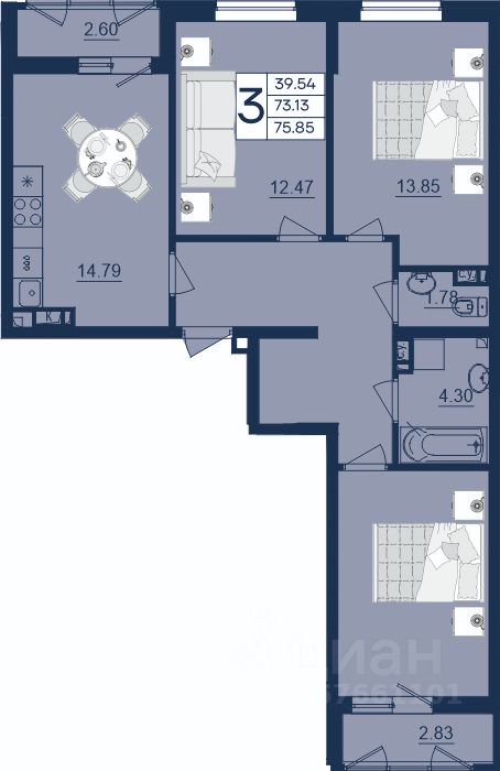 3 комнатная квартира с ремонтом 75.85 м², на 3 этаже в жилом комплексе ''Дом 101''.