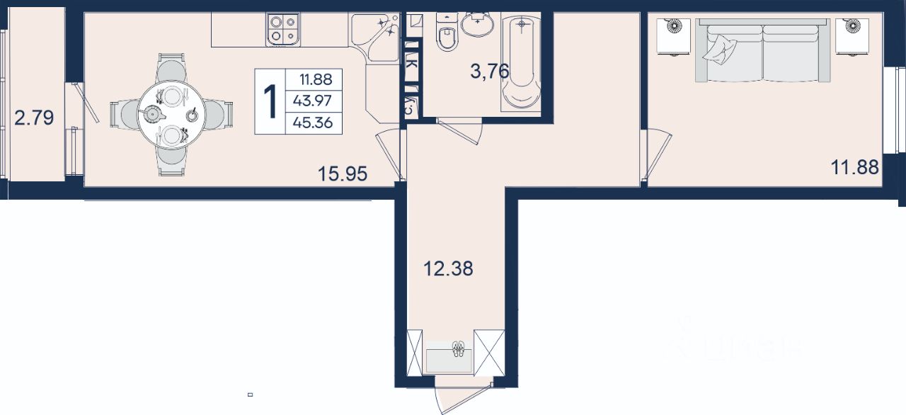 1 комнатная квартира с ремонтом 45.36 м², на 6 этаже в жилом комплексе ''Дом 101''.