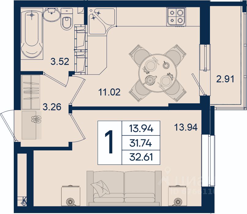 1 комнатная квартира с ремонтом 32.61 м², на 18 этаже в жилом комплексе ''Дом 101''.