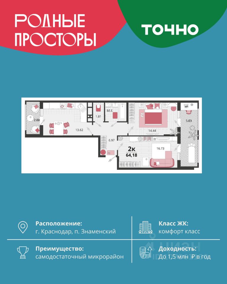 ''Родные просторы''- самодостаточный микрорайон, который реализован по принципу комплексного развития территории, где есть вся инфраструктура для комфортной жизни. На территории 41 га 29 домов от 9 до 24 этажей, уютные дворы со спортивными и игровыми площадками, социальные и коммерческие объекты, зеленые массивы и фонтаны. Главная точка притяжения ''Родных просторов'' - парк семейного отдыха площадью 9 га, 4,5 км прогулочных аллей, амфитеатр для мероприятий, кинофестивальная площадка. Особая гордость микрорайона современная школа на 1550 мест и 3 детских сада ''Ладушки'', ''Веснушки'' и ''Топотушки'' на 880 малышей. В центре микрорайона строятся фитнес-клуб BALANCE с акватермальным комплексом и собственная поликлиника, площадью более 5000 кв.м.