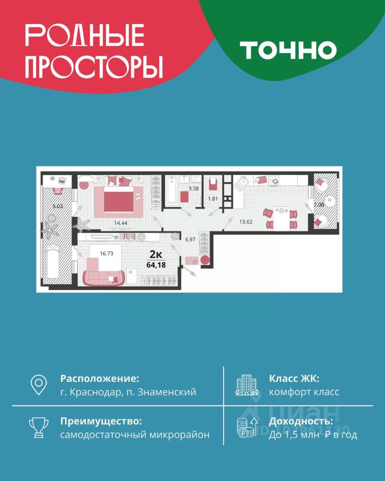 ''Родные просторы''- самодостаточный микрорайон, который реализован по принципу комплексного развития территории, где есть вся инфраструктура для комфортной жизни. На территории 41 га 29 домов от 9 до 24 этажей, уютные дворы со спортивными и игровыми площадками, социальные и коммерческие объекты, зеленые массивы и фонтаны. Главная точка притяжения ''Родных просторов'' - парк семейного отдыха площадью 9 га, 4,5 км прогулочных аллей, амфитеатр для мероприятий, кинофестивальная площадка. Особая гордость микрорайона современная школа на 1550 мест и 3 детских сада ''Ладушки'', ''Веснушки'' и ''Топотушки'' на 880 малышей. В центре микрорайона строятся фитнес-клуб BALANCE с акватермальным комплексом и собственная поликлиника, площадью более 5000 кв.м.