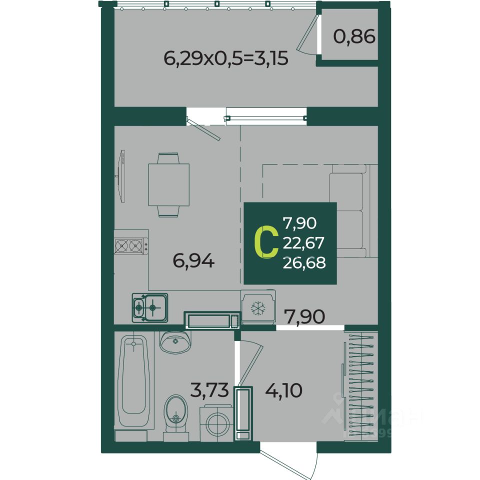 Общая площадь26,68 м2