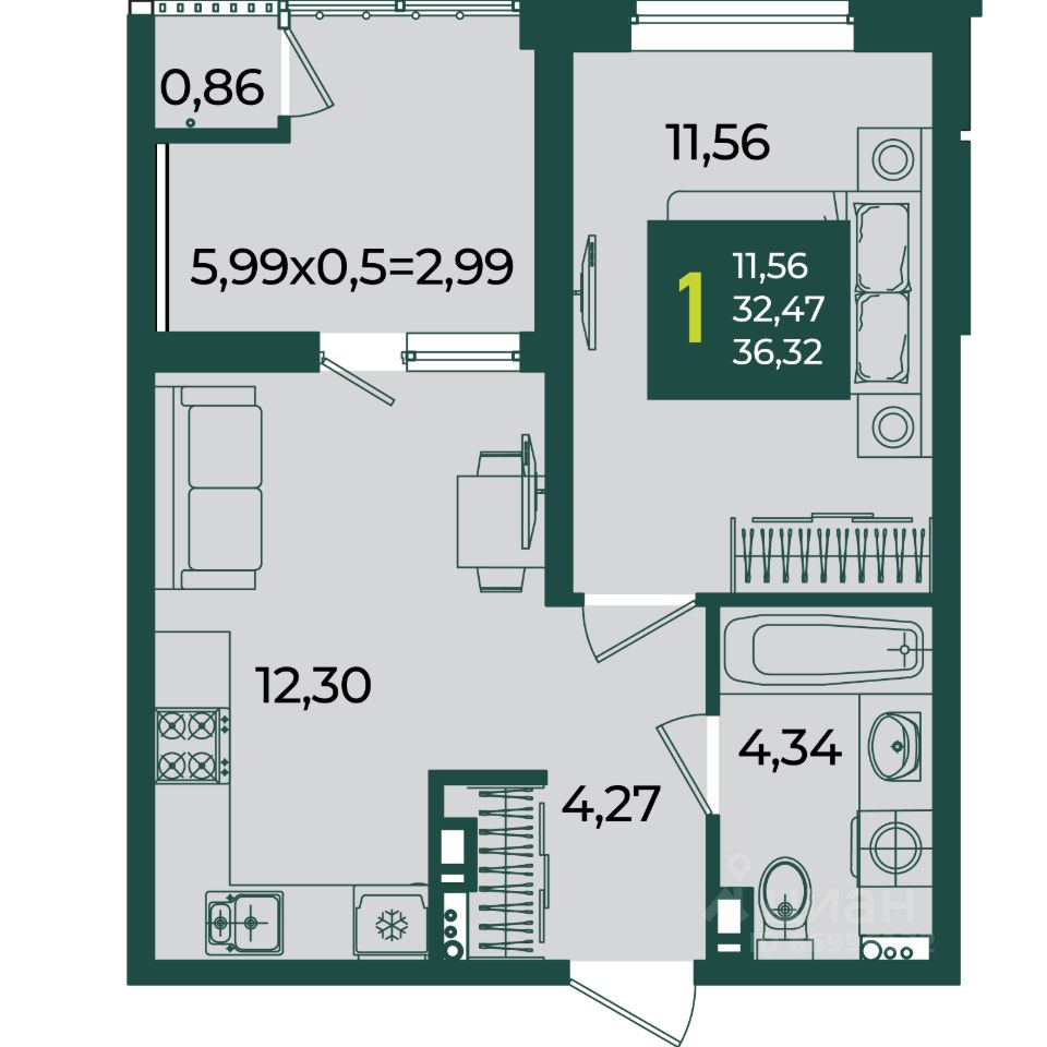 Общая площадь36,32 м2