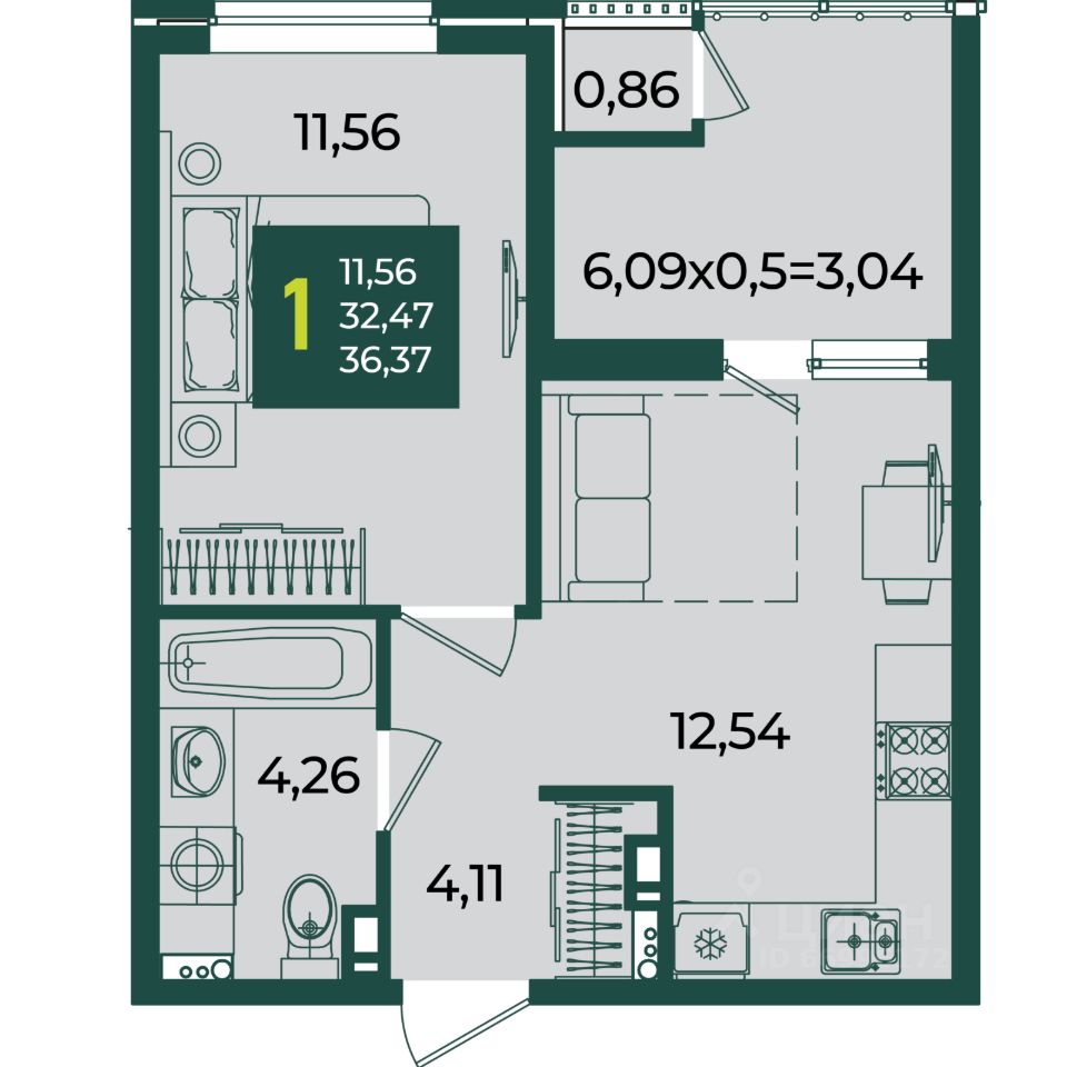 Общая площадь36,37 м2