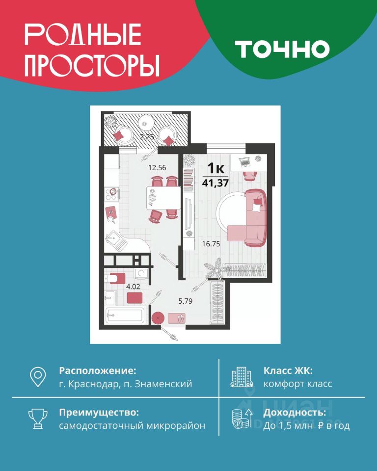 ''Родные просторы''- самодостаточный микрорайон, который реализован по принципу комплексного развития территории, где есть вся инфраструктура для комфортной жизни. На территории 41 га 29 домов от 9 до 24 этажей, уютные дворы со спортивными и игровыми площадками, социальные и коммерческие объекты, зеленые массивы и фонтаны. Главная точка притяжения ''Родных просторов'' - парк семейного отдыха площадью 9 га, 4,5 км прогулочных аллей, амфитеатр для мероприятий, кинофестивальная площадка. Особая гордость микрорайона современная школа на 1550 мест и 3 детских сада ''Ладушки'', ''Веснушки'' и ''Топотушки'' на 880 малышей. В центре микрорайона строятся фитнес-клуб BALANCE с акватермальным комплексом и собственная поликлиника, площадью более 5000 кв.м.