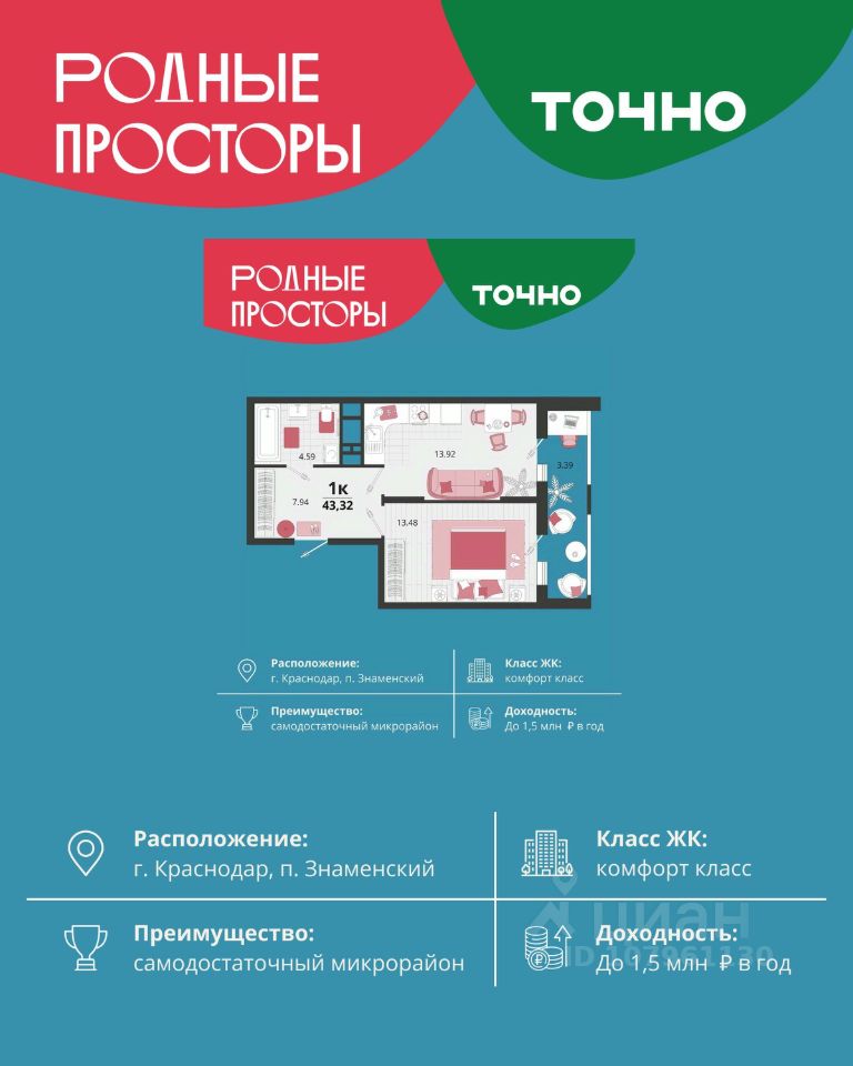 ''Родные просторы''- самодостаточный микрорайон, который реализован по принципу комплексного развития территории, где есть вся инфраструктура для комфортной жизни. На территории 41 га 29 домов от 9 до 24 этажей, уютные дворы со спортивными и игровыми площадками, социальные и коммерческие объекты, зеленые массивы и фонтаны. Главная точка притяжения ''Родных просторов'' - парк семейного отдыха площадью 9 га, 4,5 км прогулочных аллей, амфитеатр для мероприятий, кинофестивальная площадка. Особая гордость микрорайона современная школа на 1550 мест и 3 детских сада ''Ладушки'', ''Веснушки'' и ''Топотушки'' на 880 малышей. В центре микрорайона строятся фитнес-клуб BALANCE с акватермальным комплексом и собственная поликлиника, площадью более 5000 кв.м.