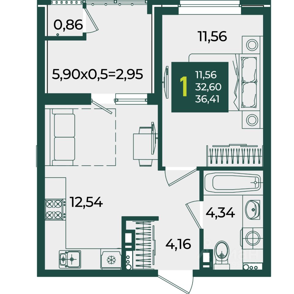 Общая площадь36,41 м2