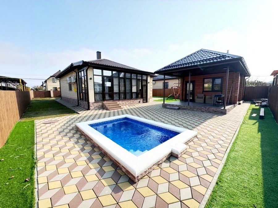 В продаже просторный 1-этажный жилой дом ! В коттеджном поселки КП Морской, в 3 км от моря ! Общая площадь дома 130 кв. Расположен на просторном земельном участке 6.5 соток земли. Дом заходи и живи, Ремонт, Мебель, Техника. Все коммуникации, Свет, Газ, Центральный водопровод. Комфортная планировка, три раздельных спальни,в одной из спален свой с/у и ванная, кухня гостиная с выходом на просторную застекленную террасу. На участке выполнен ландшафтный дизайн, детская зона, открытый уличный бассейн 2.5*3.5 , 1.5 глубиной. Также во дворе есть баня с комнатой отдыха 28 кв, парилка, душ, с/у. Летняя терраса , зона отдыха с барбекю. Перед домом большой навес над всем двором, парковка для двух автомобилей. Асфальтированная широкая улица с освещением.