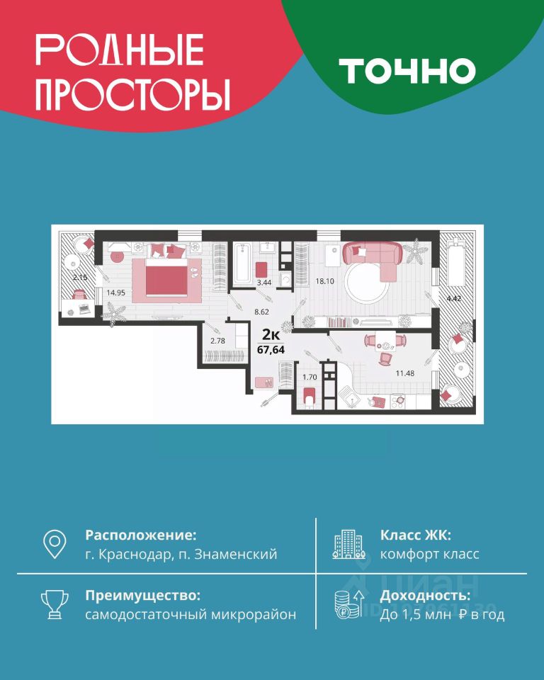 ''Родные просторы''- самодостаточный микрорайон, который реализован по принципу комплексного развития территории, где есть вся инфраструктура для комфортной жизни. На территории 41 га 29 домов от 9 до 24 этажей, уютные дворы со спортивными и игровыми площадками, социальные и коммерческие объекты, зеленые массивы и фонтаны. Главная точка притяжения ''Родных просторов'' - парк семейного отдыха площадью 9 га, 4,5 км прогулочных аллей, амфитеатр для мероприятий, кинофестивальная площадка. Особая гордость микрорайона современная школа на 1550 мест и 3 детских сада ''Ладушки'', ''Веснушки'' и ''Топотушки'' на 880 малышей. В центре микрорайона строятся фитнес-клуб BALANCE с акватермальным комплексом и собственная поликлиника, площадью более 5000 кв.м.