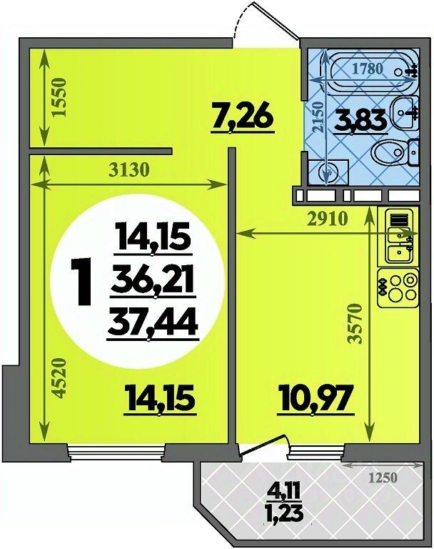 Продаётся 1-комнатная квартира в строящемся доме (Литер 2), срок сдачи: III-кв. 2027, общей площадью 37.44 кв.м., на 3 этаже.