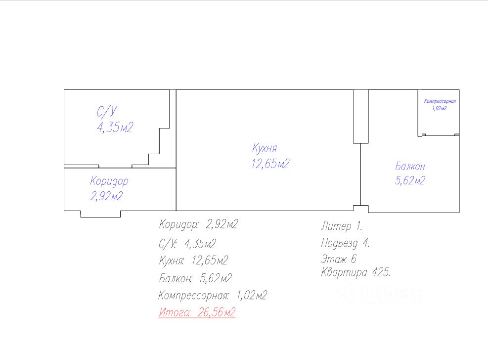 Жилая зона: 12,65 кв. м. Кухня: 4 кв. м. Санузел: 4,35 кв. м. совмещенный Прихожая: 2,92 кв. м. Балкон: 5,62 кв. м.