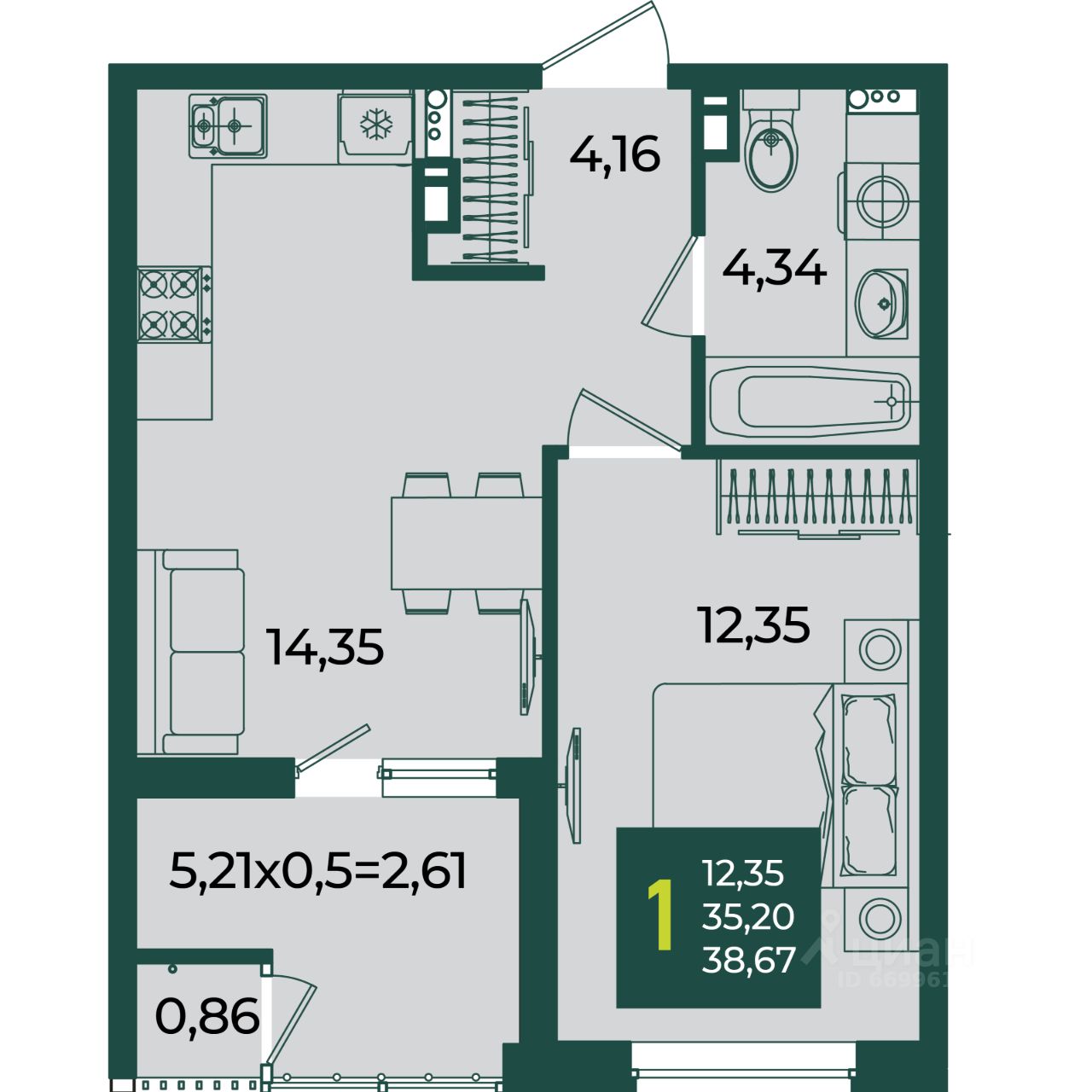 Общая площадь38,67 м2