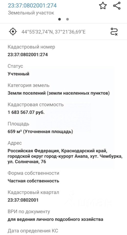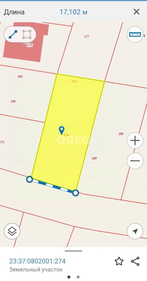 Назначение участка - для ведения личного подсобного хозяйства, кадастровый номер 23:37:0802001:274
