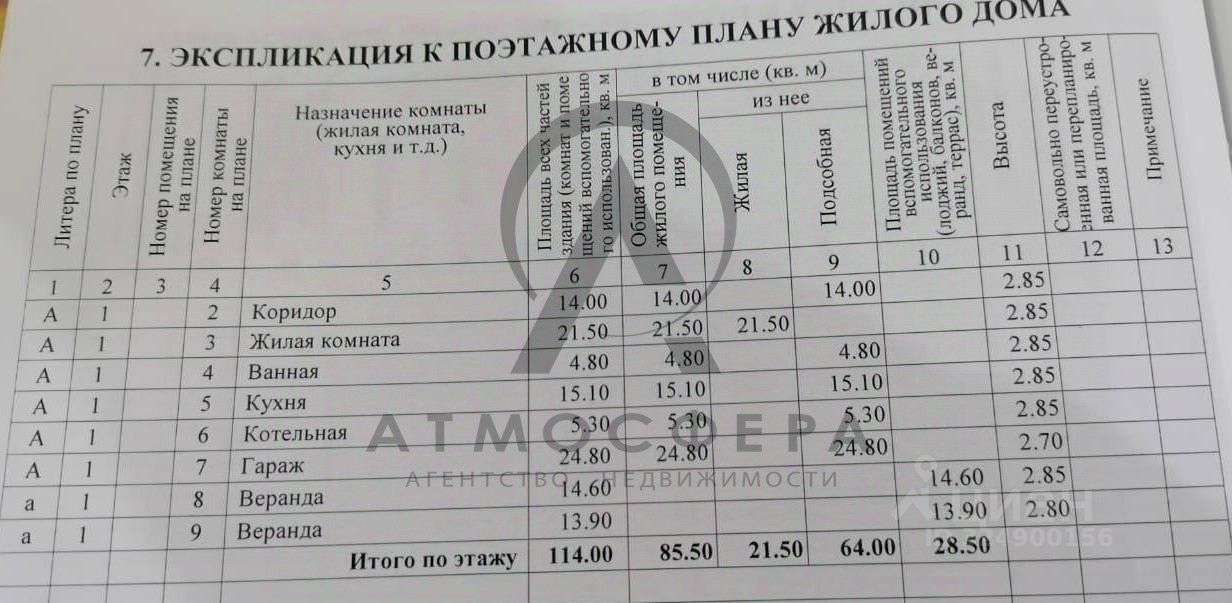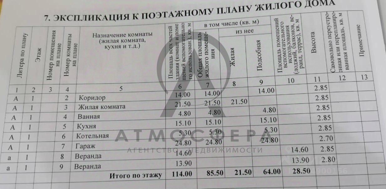 На первом этаже расположена веранда 13,9 + 14,6 кв. м., отапливаемый гараж 24,8 кв. м., котельная 5,3 кв. м., столовая 15,1 кв. м., погреб 14,5 кв. м и высотой 2 м. (сухой), совмещенный санузел 4,8 кв. м., коридор 14 кв. м. и гостиная 21,5 кв. м. Высота потолков первого этажа составляет 2 м 85 см.