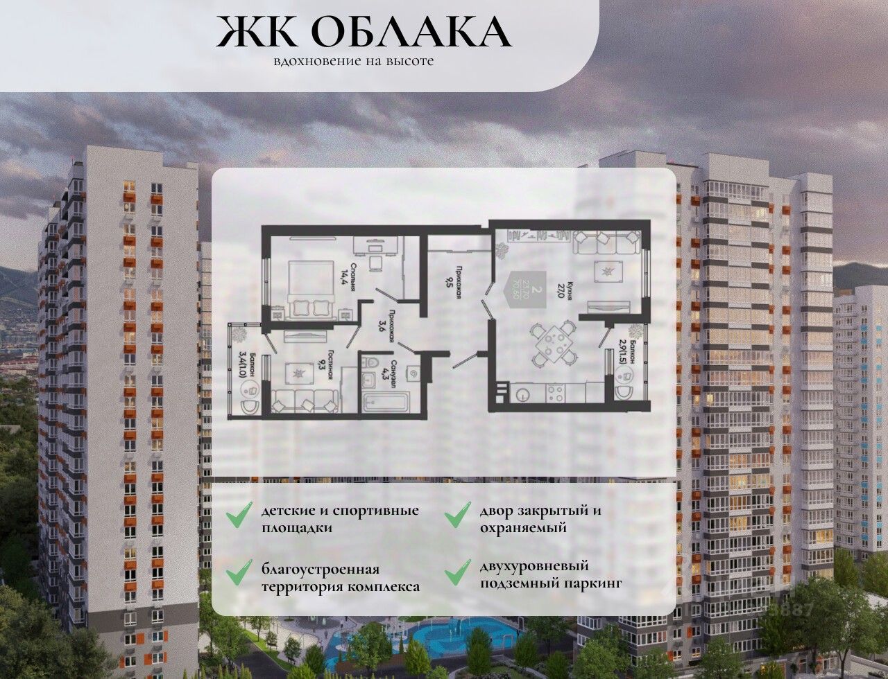Проект включает в себя 2 дома высотой 18-21 этаж. В подъездах выполнена дизайнерская отделка в светлой цветовой гамме, для удобства жителей в местах общего пользования предусмотрена навигация. В каждой секции предусмотрены помещения для хранения велосипедов и колясок с обустроенным местом для мойки колес и лап домашних животных. Покупателям в ЖК предложено множество планировочных решений: в наличии квартиры, как классического типа, так и европланировки. На балконах и лоджиях выполнено витражное остекление. Из окон открывается шикарный вид на город и море. Квартиры сдаются без отделки. Двор комплекса закрыт от автомобилей и случайных прохожих. Для автовладельцев предусмотрен двухуровневый подземный паркинг на 650 мест. По всему периметру двора размещены видеокамеры. Внутренний двор благоустроен: предусмотрены пешеходные дорожки, скамейки и деревянные мини-беседки с розетками. Также спроектированы детские игровые площадки, уличные тренажеры и спортивная площадка для командных игр. Жилой комплекс расположен в южной части Новороссийска, на пересечении Мысхакского шоссе и улицы Куникова. Инфраструктура района развита: в пешей доступности детские сады, школы, аптеки и поликлиники, магазины и парки.