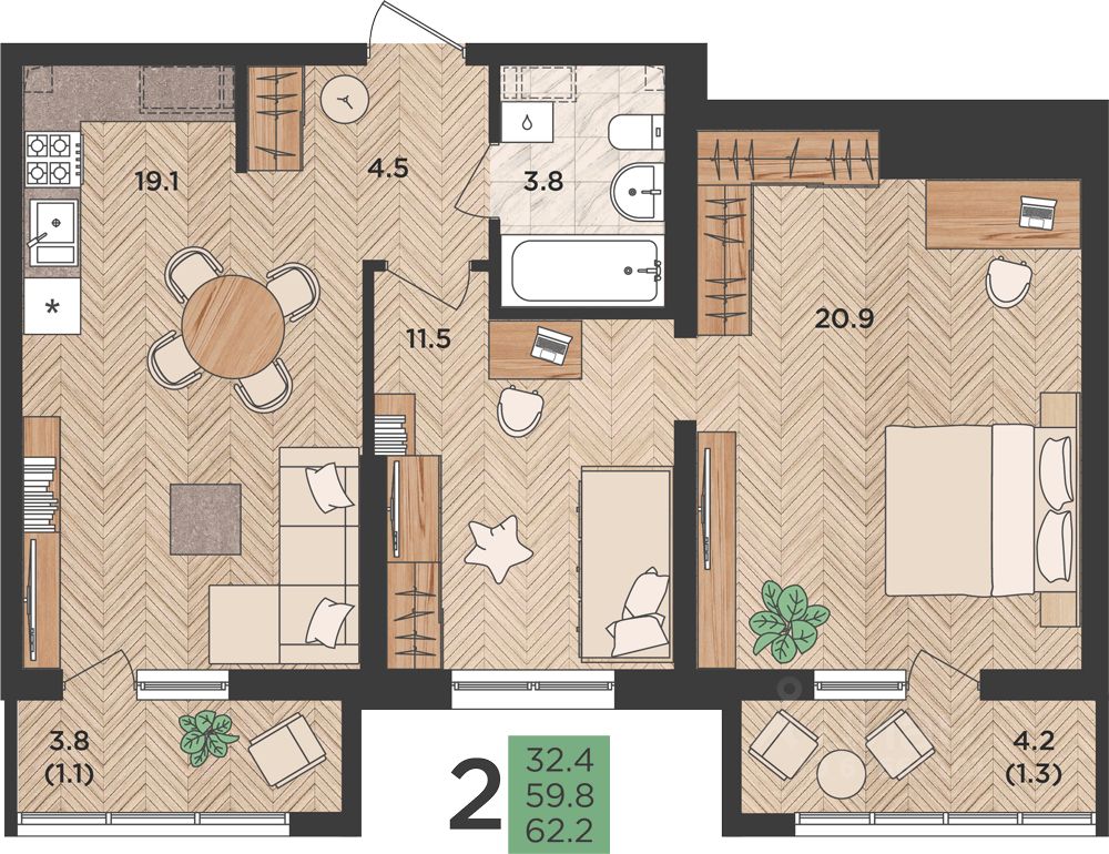 Общая площадь62,2 м2