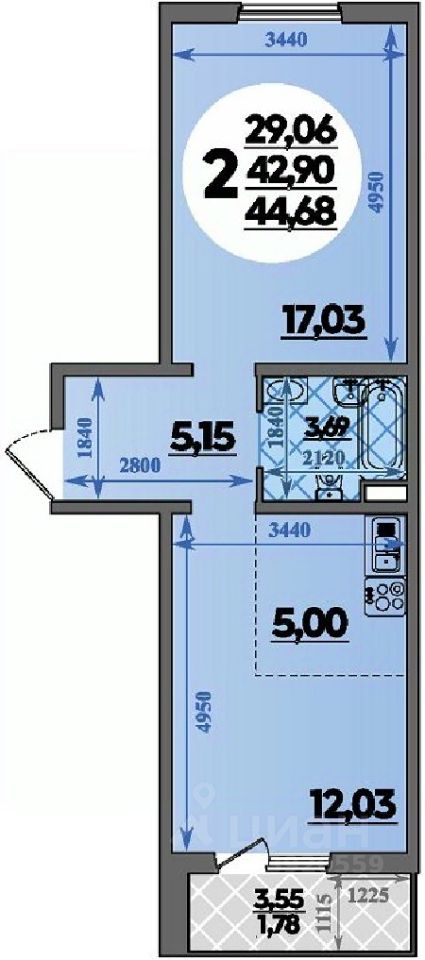 Общая площадь44,68 м2