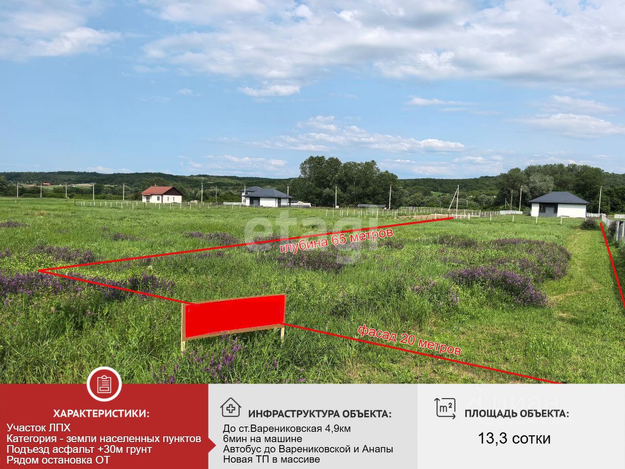 Участок ровный без перепадов высот. Соседи живут круглогодично. Рядом Варениковская (10 мин), Крымск(40 мин). До Краснодара 100 минут на машине, до Славянска-на-Кубани 1 час. До пляжей Краснодарского края Голубицкая 60 минут, Благовещенская 70 минут.