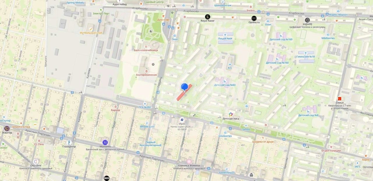 - Детский развивающий центр ''Детская лига'' - Фестивальный сквер , - Стоматологии, Поликлиники, Аптеки. - фитнесс центры Х-фит, Орандж фитнес, Медведь, Территория фитнеса - Клиника Екатерининская, Бальнеолечебница, Центр Офтальмологии. - Магнит, Пятерочка, Прикубанский рынок.