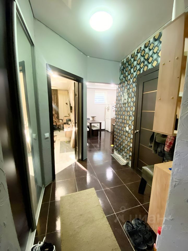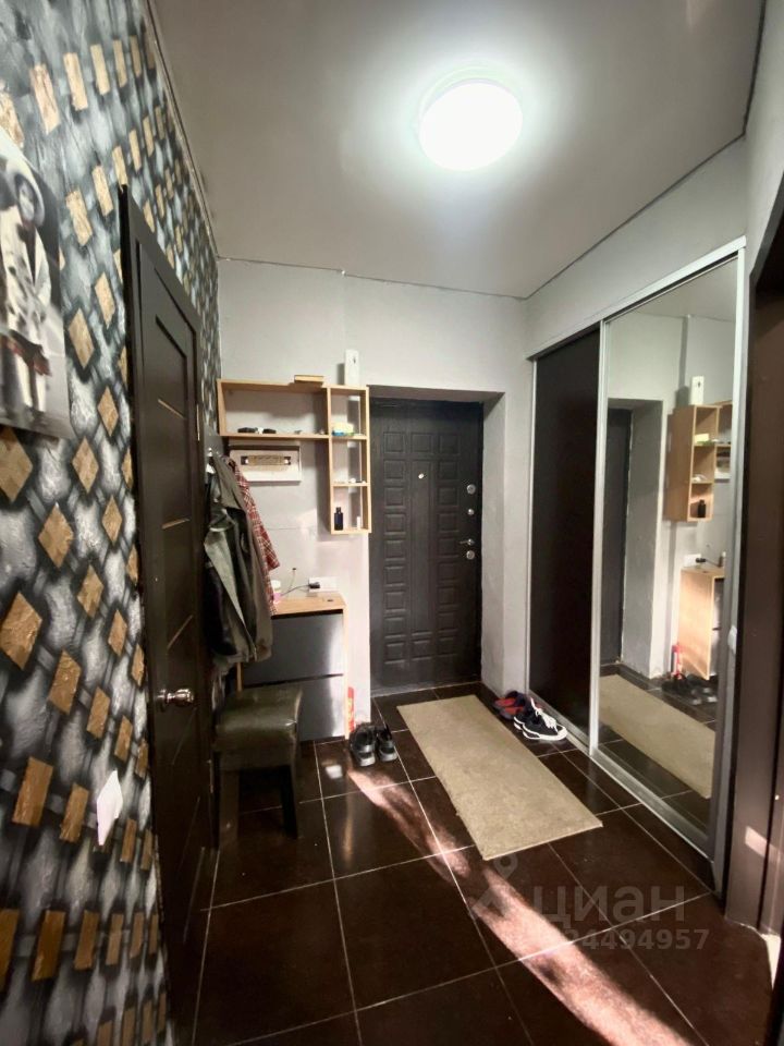 В квартире просторная планировка с комнатой, кухней и удобной прихожей, где есть возможность выделить зону гардеробной.