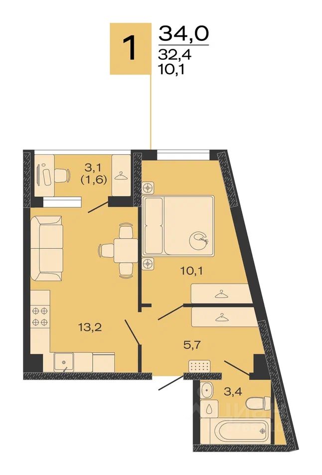 Общая площадь34 м2