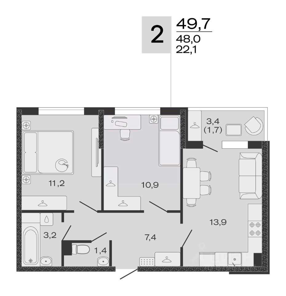 Общая площадь49,7 м2