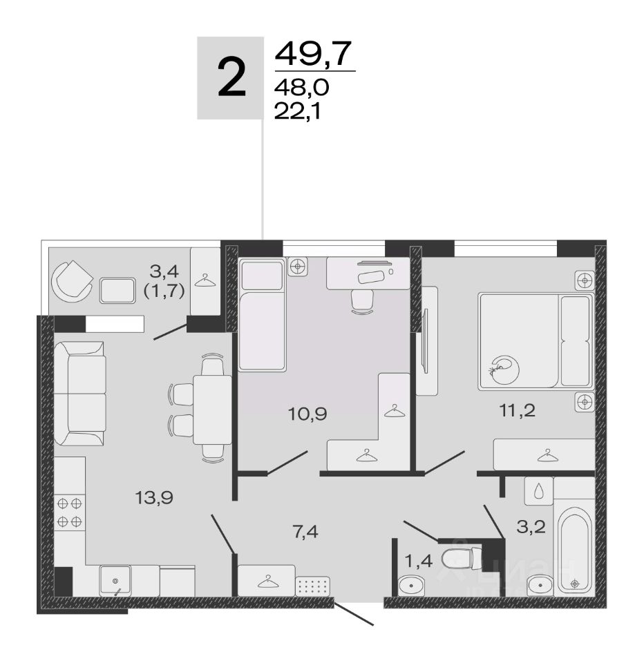 Общая площадь49,7 м2