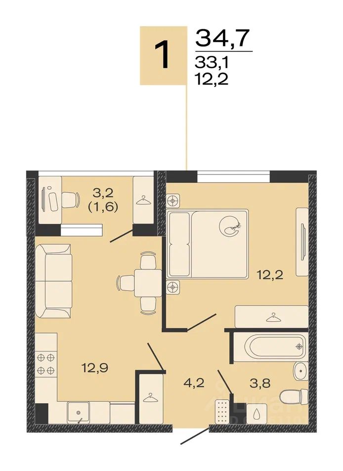Общая площадь34,7 м2