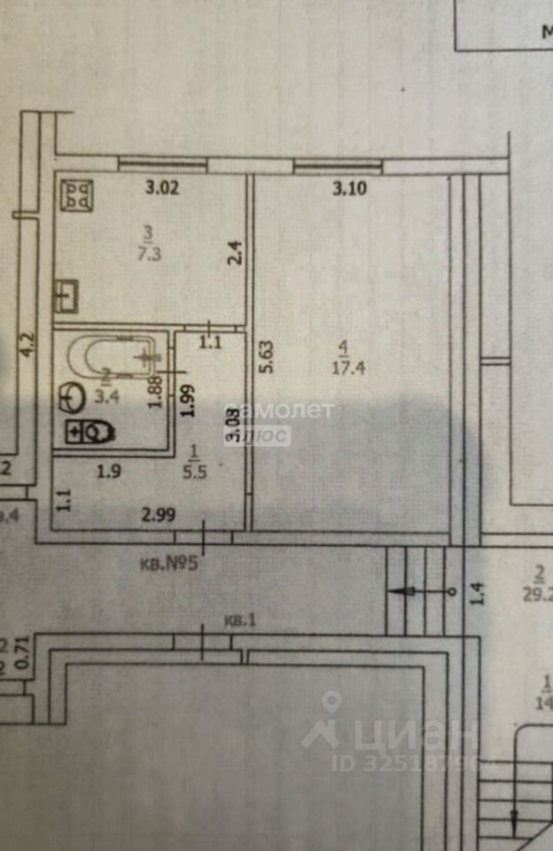 Квартира общей площадью 33,6 кв. м. (комната 17,4 кв. м., кухня 7,3 кв. м., сан. узел совмещенный 3,4 кв. м., прихожая 5,5 кв. м., окна выходят на улицу).