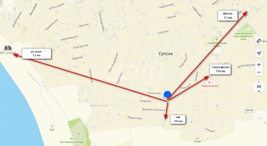 Двухэтажный дом площадью 180 кв.м. (по ПКК 144,3 кв. м , была достройка) расположен в селе Супсех, в 1 км от курортного поселка Анапа. Объект разделен на две независимые квартиры с отдельными входами, что обеспечивает комфортное проживание для двух семей или возможность сдачи одной из частей в аренду. Первая квартира включает на первом этаже прихожую, кухню, санузел и комнату, на втором — еще одну комнату. Вторая квартира более просторная: на первом этаже расположены прихожая, кухня, гостиная и санузел, на втором — холл, три спальни и санузел с душевой кабиной. Дом построен из качественных материалов с внешней отделкой ''короед'', что обеспечивает долговечность и эстетичный внешний вид.